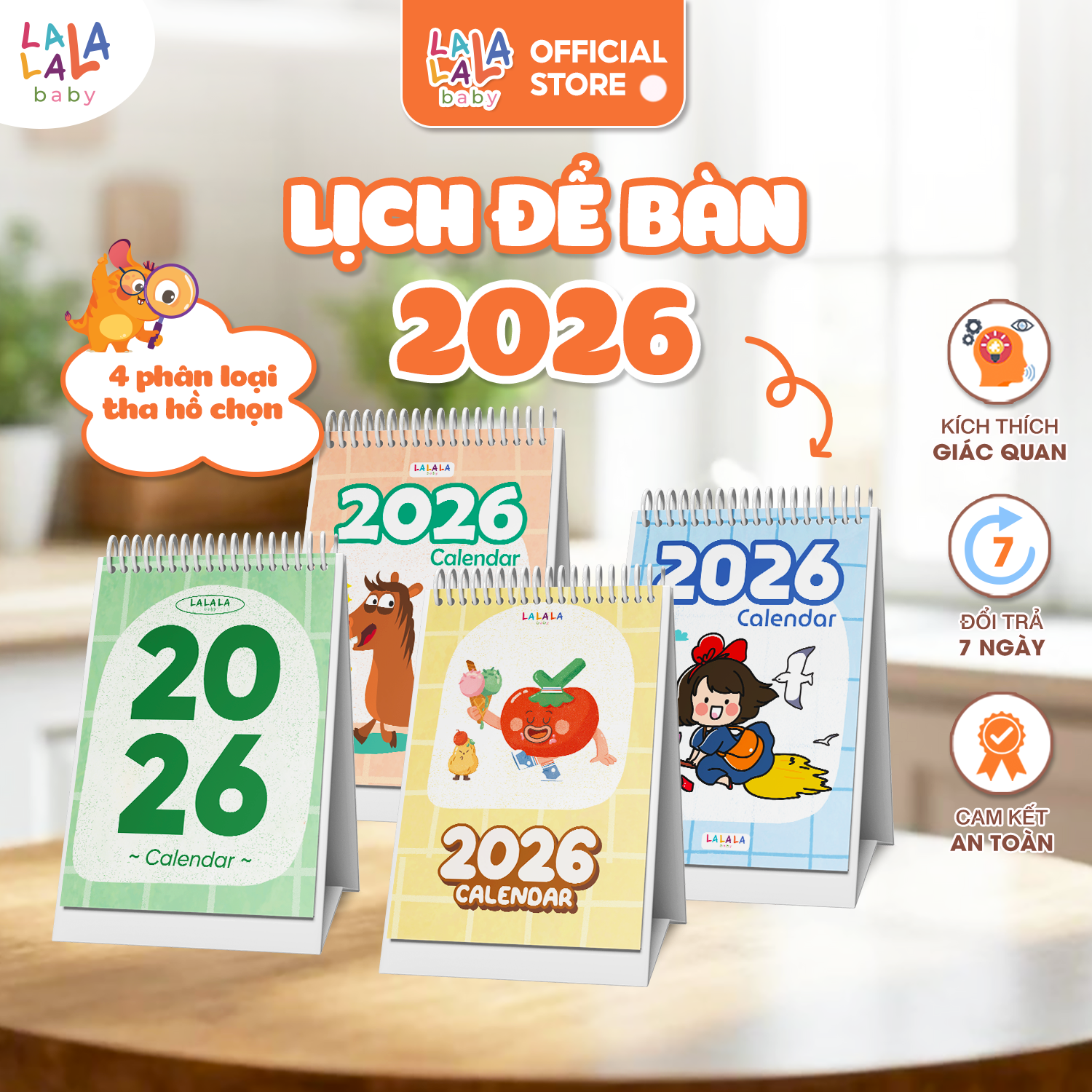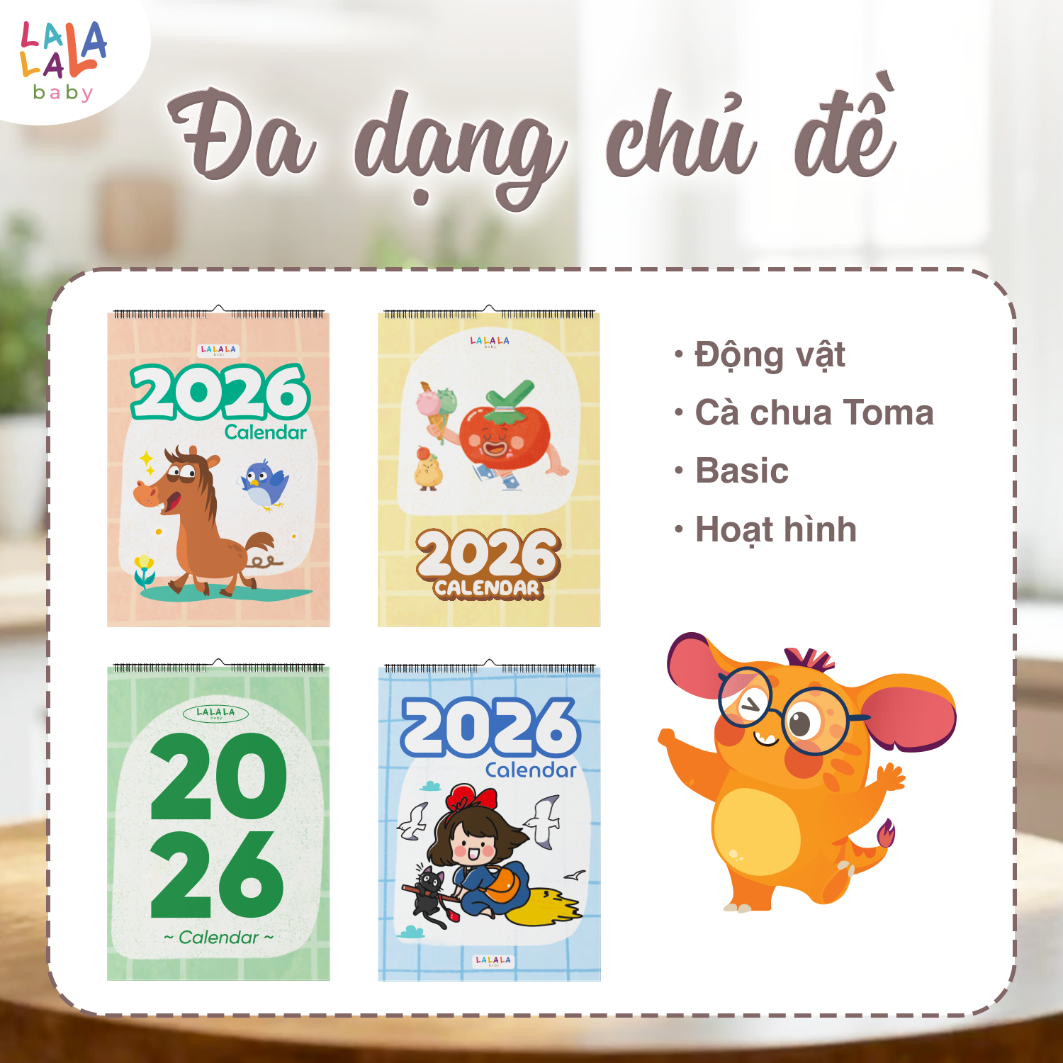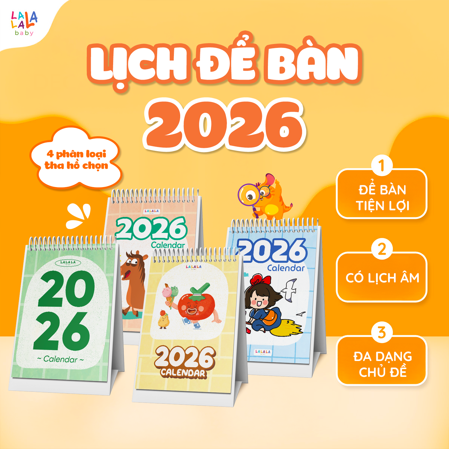 Lịch để bàn 2026 có lịch âm mini cute kèm ghi chú Calendar nhiều mẫu Lalala Baby đơn giản, nhỏ gọn, xinh xắn. Mẫu lịch thiết kế trang trí bàn làm việc, không chiếm nhiều diện tích. Một trong những gợi ý về mẫu quà tặng doanh nghiệp, tặng nhân viên, khách hàng, đối tác dịp cuối năm.
